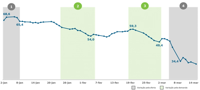 A partir de meados de janeiro, os impactos na economia chinesa das medidas de contenção adotadas pelo governo intensificaram a trajetória de queda nos preços. Entre 23 de janeiro - antevéspera do ano-novo chinês - e 04 de fevereiro, os preços apresentaram uma queda acumulada superior a 10%, cotados abaixo dos US$ 54/barril.