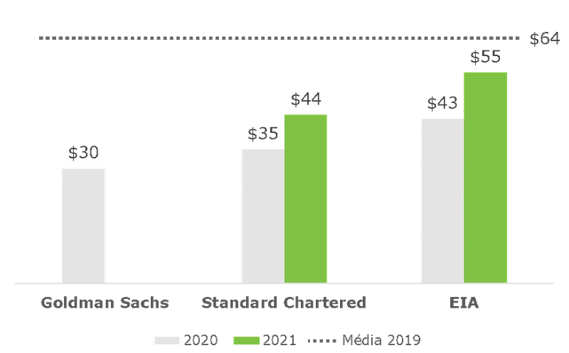 Nesse cenário, a Agência Internacional de Energia (IEA, na sigla em inglês) espera uma retração de 90 mil barris/dia na demanda por petróleo para 2020, em comparação com 2019. Se confirmado, esse resultado representaria a primeira queda na variação anual da demanda desde 2009. A estimativa da IEA ainda prevê uma redução maior, de 730 mil barris/dia, em um cenário de falha nas medidas de controle ou um crescimento de 480 mil barris/dia, caso haja uma contenção rápida da doença[9].