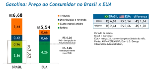 A figura abaixo apresenta um comparativo dos preços médios de gasolina ao consumidor em março de 2022 no Brasil e nos Estados Unidos com suas principais parcelas, com destaque para a diferença da carga tributária.