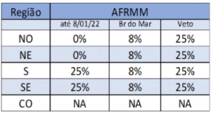No entanto, foi vetado pelo Exmo. Sr. Presidente da República, o artigo que reduzia as alíquotas do AFRMM – Adicional de Frete para Renovação da Marinha Mercante, tributo incidente sobre o transporte aquaviário da carga descarregada em porto brasileiro (frete) - particularmente no que se refere à navegação de cabotagem e de longo curso, cuja proposta era de 8%.