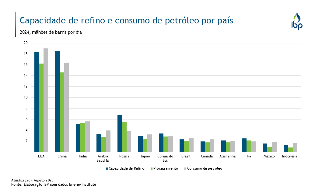 A capacidade instalada de refino global atingiu 104,5 milhões de barris por dia (b/d) em 2024, segundo o Energy Institute. A Ásia-Pacífico responde por 36% do total, seguida pela América do Norte (20%) e Europa (14,4%). Estados Unidos e China, os maiores consumidores mundiais de petróleo, concentram mais de um terço da capacidade global de refino, enquanto o Brasil ocupa a 9ª posição com 2,3 milhões b/d. Paralelamente, o consumo global de petróleo registrou leve expansão de 0,7% em relação ao ano anterior, indicando estabilização da demanda mundial.