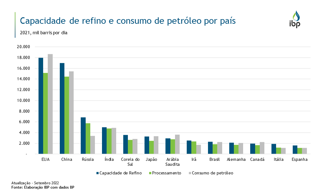 A capacidade instalada de refino global atingiu quase 102 milhões de barris por dia (b/d) em 2021, segundo dados da BP. A região da Ásia-Pacífico responde por 35,8% do total, seguida pela América do Norte e Europa com, respectivamente, 21,1% e 14,8%. EUA e China, os maiores consumidores de petróleo, também detêm os maiores parques de refino do mundo e pouco mais de 1/3 da capacidade total. O Brasil aparece na 9ª colocação, tendo uma capacidade de 2,3 milhões b/d.
