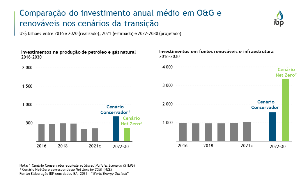 Comparação do investimento anual médio em O&G e renováveis nos cenários da transição