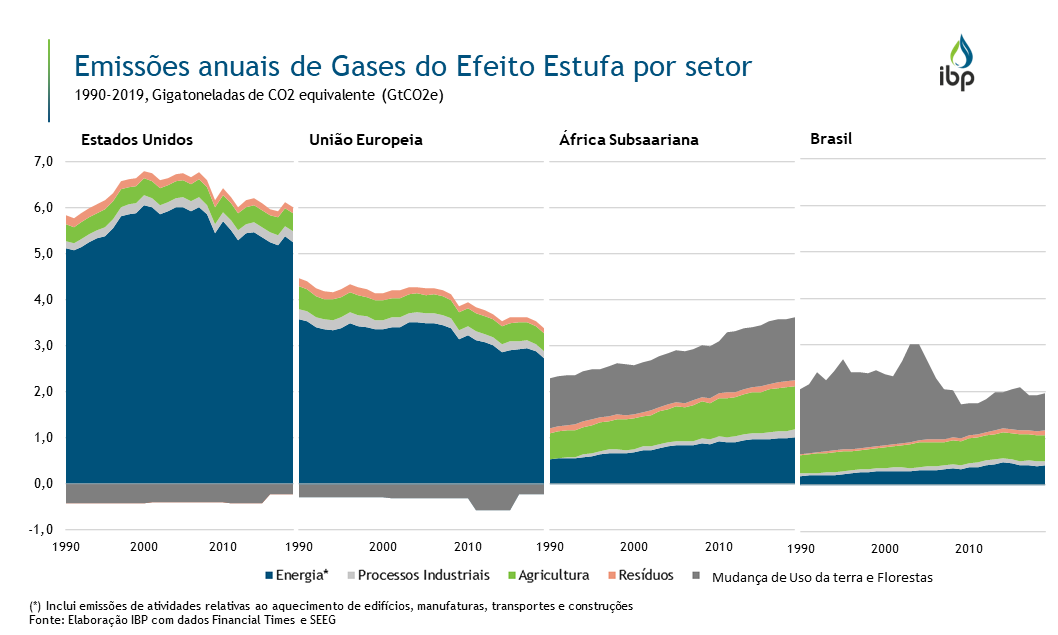 A descarbonização no continente africano traz à tona discussões acerca do conceito de transição energética justa, que considera as particularidades e as condições socioeconômicas de cada país. Em 2019, a África Subsaariana emitiu apenas 1,0 gigatoneladas de CO2 equivalente (GtCO2e) e o Brasil, 0,5 GtCO2e, enquanto os Estados Unidos sozinhos emitiram 5,3 GtCO2e e a União Europeia foi responsável por 2,7 GtCO2e das emissões globais.