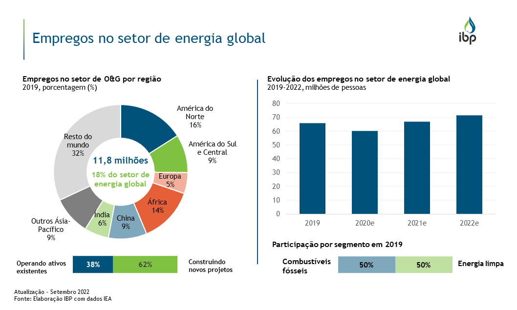 No setor de energia, após a queda dos empregos causadas pela pandemia da Covid-19, as estimativas da Agência Internacional de Energia (IEA, na sigla em inglês) apontam uma recuperação em 2022 para patamares superiores aos de 2019. Esse crescimento vem sendo puxado pelo aumento do emprego nos setores de energia limpa, que atingiu uma participação de 50% do total do setor como um todo em 2019.
