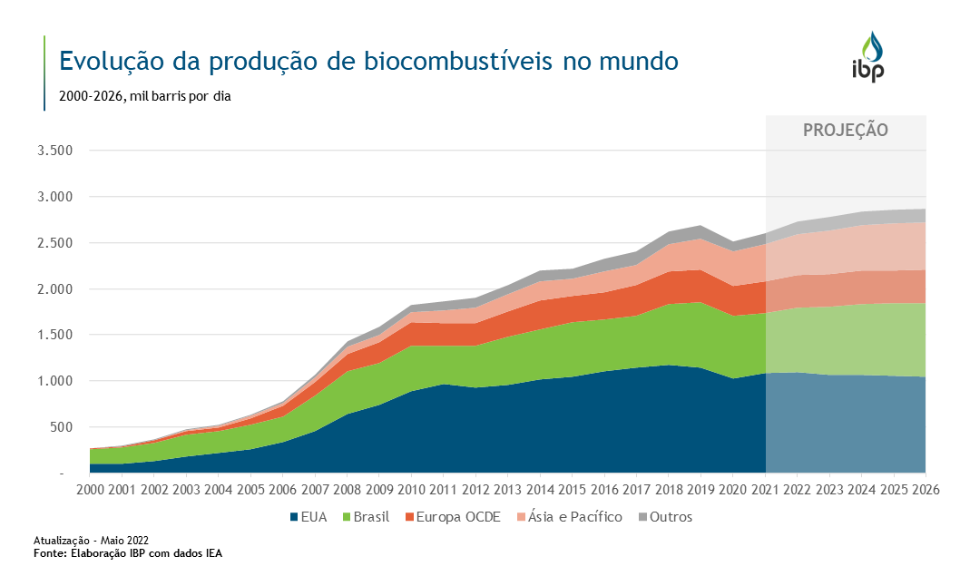 Até 2026, a Agência Internacional de Energia estima que a produção global cresça 6,8% ante o recorde de 2019, com o maior avanço ocorrendo na Ásia e Pacífico, que têm a previsão de crescer 52,9% em relação a 2019. Para o Brasil, a projeção é de um aumento de cerca de 11,7% nesse período, sendo responsável pelos maiores aumentos no consumo e produção de etanol. Além disso, espera-se que o consumo de diesel e gasolina continue crescendo ao longo desta década, dando suporte ao potencial de crescimento desses biocombustíveis devido à mistura obrigatória.