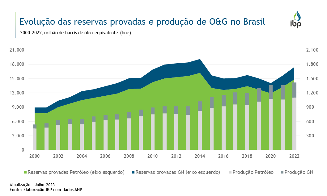 O volume de reservas provadas e produção no Brasil cresceu substancialmente entre 2000 e 2014. A atividade exploratória foi impulsionada pelas diversas rodadas de blocos que ocorreram durante o período. A produção vem acompanhando essa intensificação de atividades no setor. Com as rodadas recentes, espera-se que novas descobertas sejam feitas com a retomada da atividade exploratória. Após o declínio até 2020, as reservas provadas de petróleo e gás natural cresceram, respectivamente, 25% e 20% nos últimos dois anos. A produção de O&G, por sua vez, segue a trajetória ascendente, tendo crescido, respectivamente, 49% e 79% nos últimos dez anos.