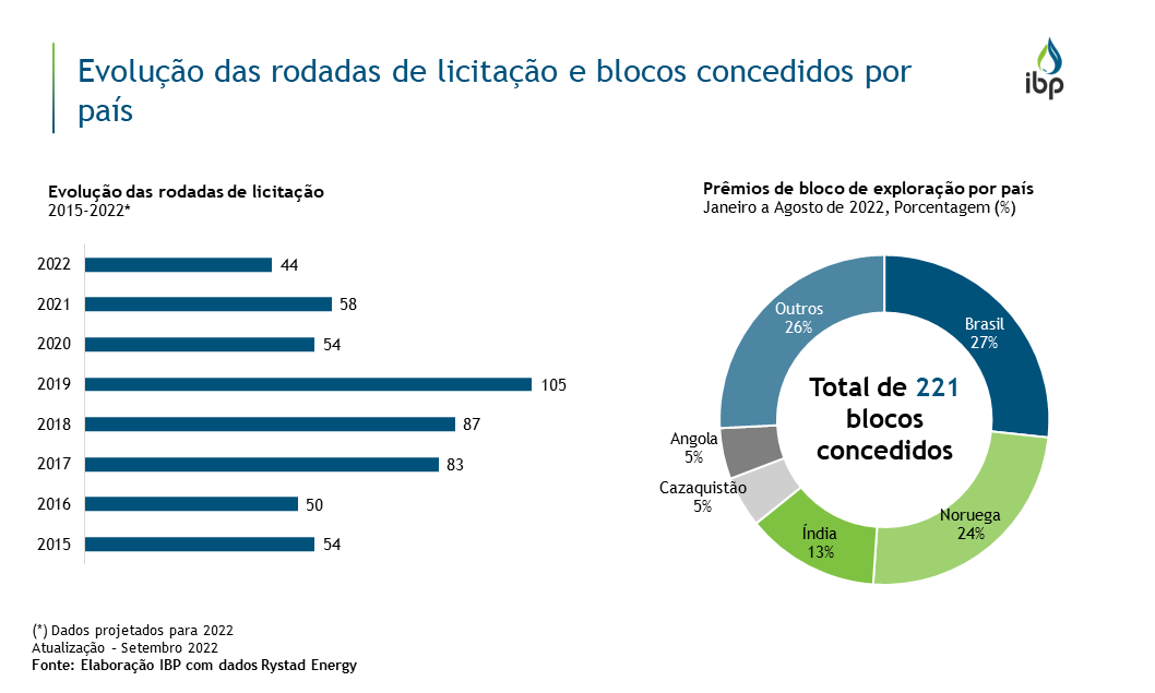 Os gastos globais em exploração estão em queda nos últimos anos à medida que as empresas de petróleo e gás procuram limitar o risco ao se concentrar em ativos produtores principais e região com produção garantida. Até agosto de 2022, apenas 21 rodadas globais de licitação foram concluídas, metade das 42 realizadas no mesmo período do ano passado. Porém, há expectativas de nesse ano sejam feitas ao todo 44 rodadas, 14 rodadas a menos que em 2021.