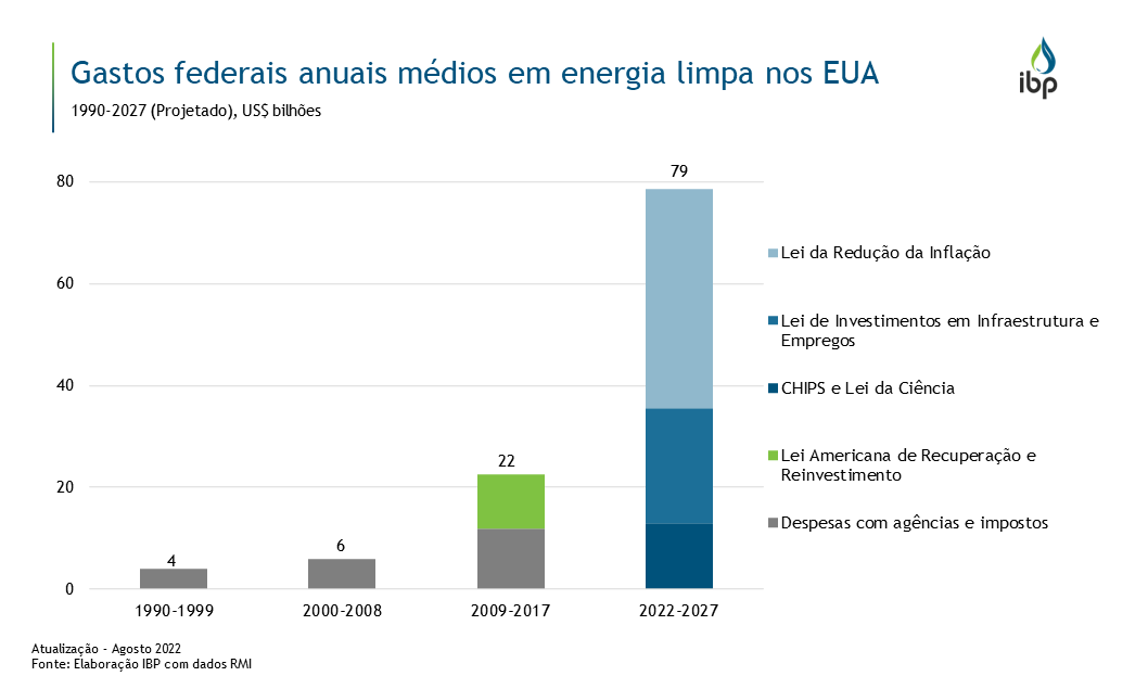 Os Estados Unidos estão realizando uma série de investimentos visando um futuro de energia limpa. Para o período de 2022 a 2027, projeta-se um gasto federal anual em energia limpa de aproximadamente 3,6 vezes seu nível entre 2009 e 2017. Quando comparado aos níveis dos anos 1990 e início de 2000, esse valor é cerca de 20 e 13 vezes maior, respectivamente.