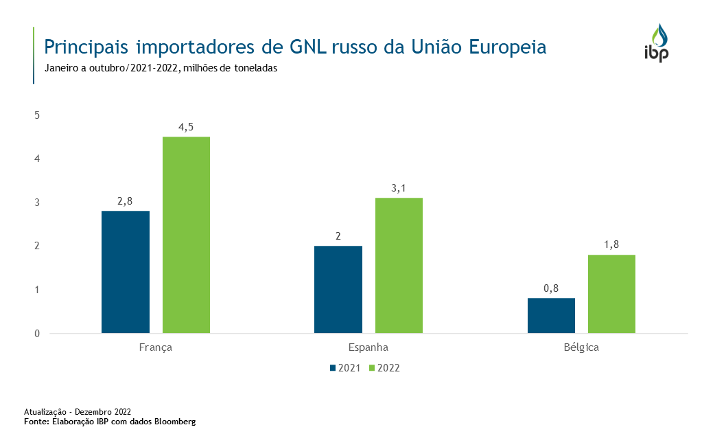 Com as sanções ocidentais, o fluxo de gás russo via gasoduto diminuiu para a Europa. Por outro lado, as importações de gás natural liquefeito (GNL) aumentaram. Os principais importadores de GNL russo as União Europeia são a França, Espanha e Bélgica. As importações de GNL pela França aumentaram cerca de 60% entre janeiro a outubro de 2021 e o mesmo período em 2022, enquanto a Bélgica mais que dobrou suas importações.