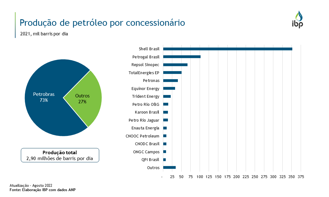 Em 2021, o Brasil produziu uma média diária de 2,90 milhões de barris de petróleo, sendo a Petrobras, como concessionária, responsável por 2,12 milhões (73% do total). Todos os outros concessionários produziram, conjuntamente, 782 mil barris por dia. O número de concessionários produzindo no país vem crescendo, consequência dos leilões de concessão realizados na última década e dos desinvestimentos da Petrobras.