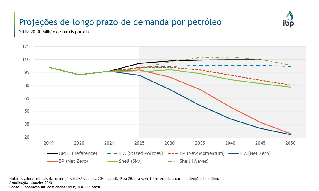 Quatro cenários assumem a continuidade das políticas já existentes ou anunciadas: (i) New Momentum, da BP, (ii) Waves, da Shell, ambos com projeção até 2050; (iii) Reference, da OPEP, até 2045; e (iv) Stated Policies, da IEA, também até 2050.
