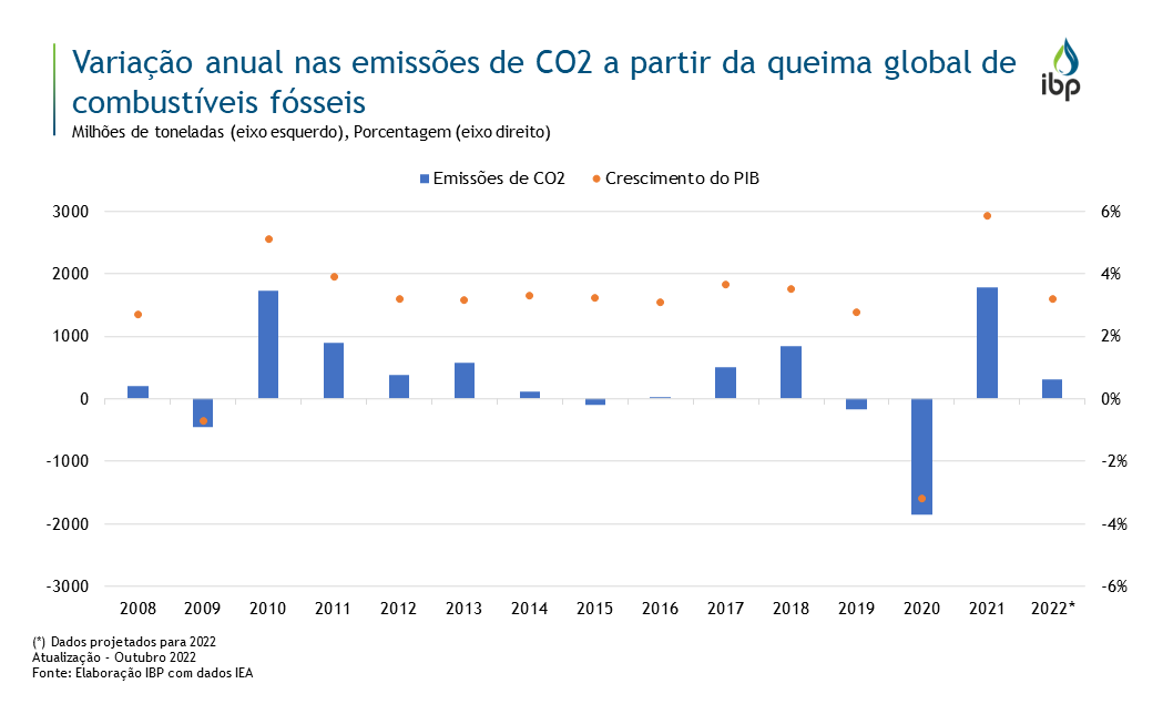De acordo com a análise da Agência Internacional de Energia (IEA), as emissões de CO₂ provenientes de combustíveis fósseis devem aumentar em aproximadamente 300 milhões de toneladas em 2022, um crescimento muito menor do que o salto de 2 bilhões de toneladas em 2021. Destaca-se que o aumento significativo em 2021 foi resultado da recuperação global da crise econômica provocada pela pandemia do coronavírus.