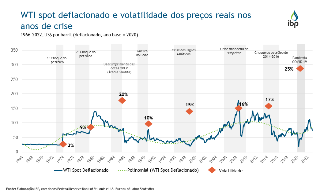 A Covid-19 gerou a maior volatilidade dos preços reais do WTI se comparada às crises do setor nos últimos 60 anos. A análise do histórico de preços reais reforça o caráter mais volátil das cotações, sobretudo nos últimos vinte anos, com tendência de variações cada vez maiores dos preços reais.